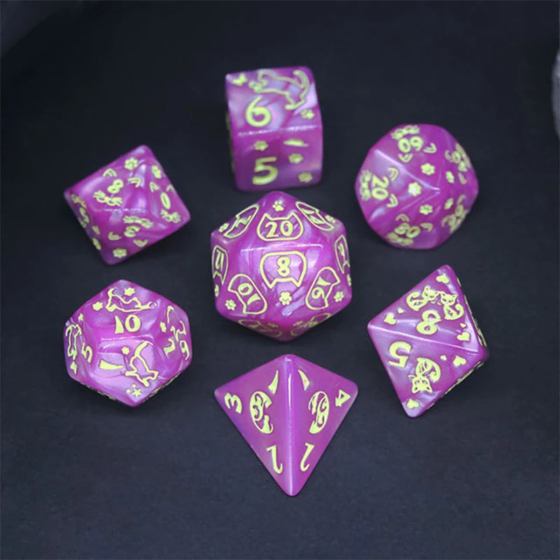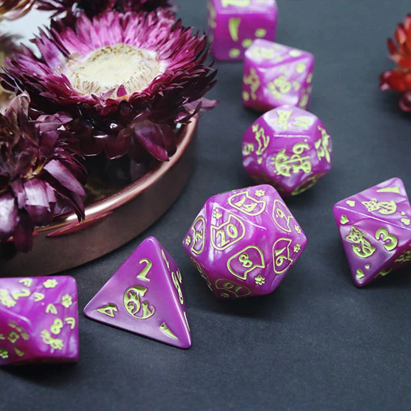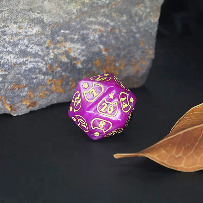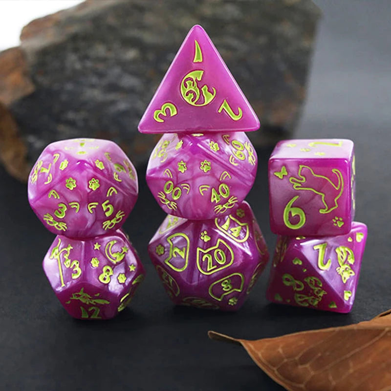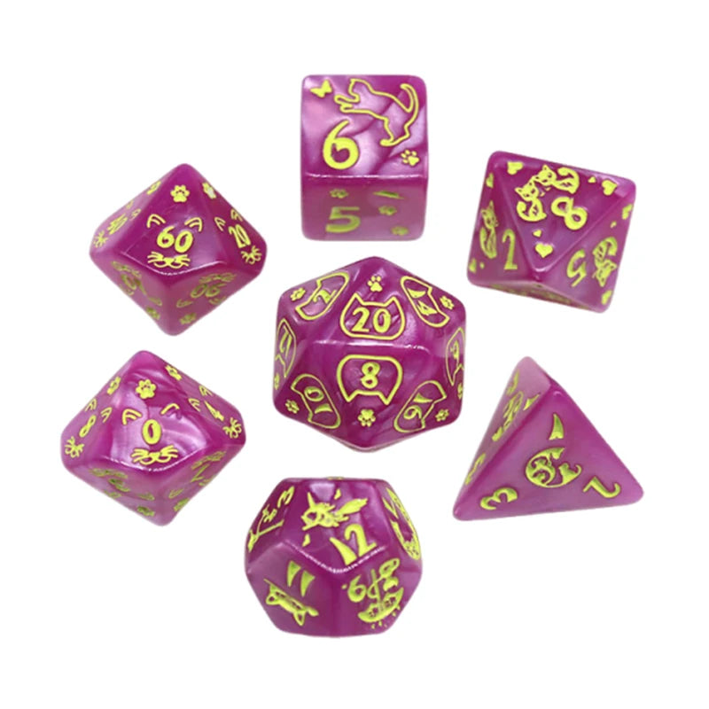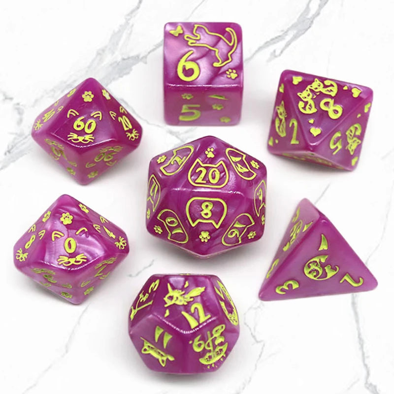 This vibrant set of purple dice, etched with playful cat motifs and paw prints, is perfect for TTRPG players who know that every crit is just a whisker away. Whether you’re sneaking through dungeons or chasing down chaotic magic, these dice bring feline charm to every roll.