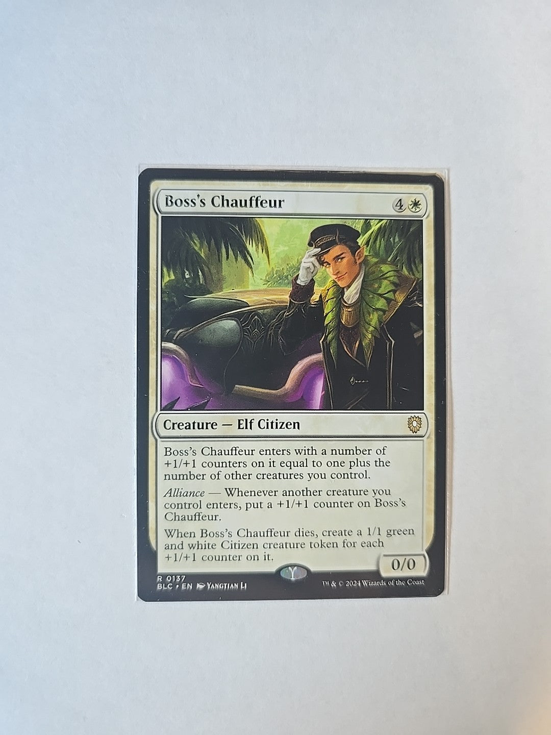 The Boss's Chauffeur Commander: Bloomburrow Regular card is a rare creature from the Magic: The Gathering game. It belongs to the white color category and features a Citizen and Elf creature type. The card has a cost of 4 W and is illustrated by Yangtian Li. With a defense/toughness of 0 and an attack/power of 0, this English-language card is a valuable addition for collectors and players of the game.